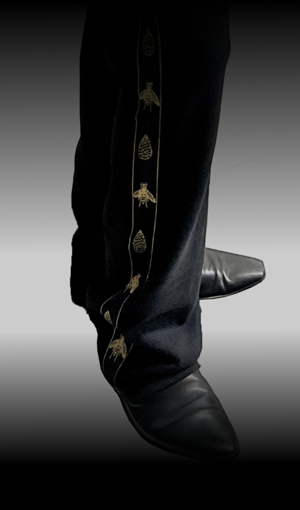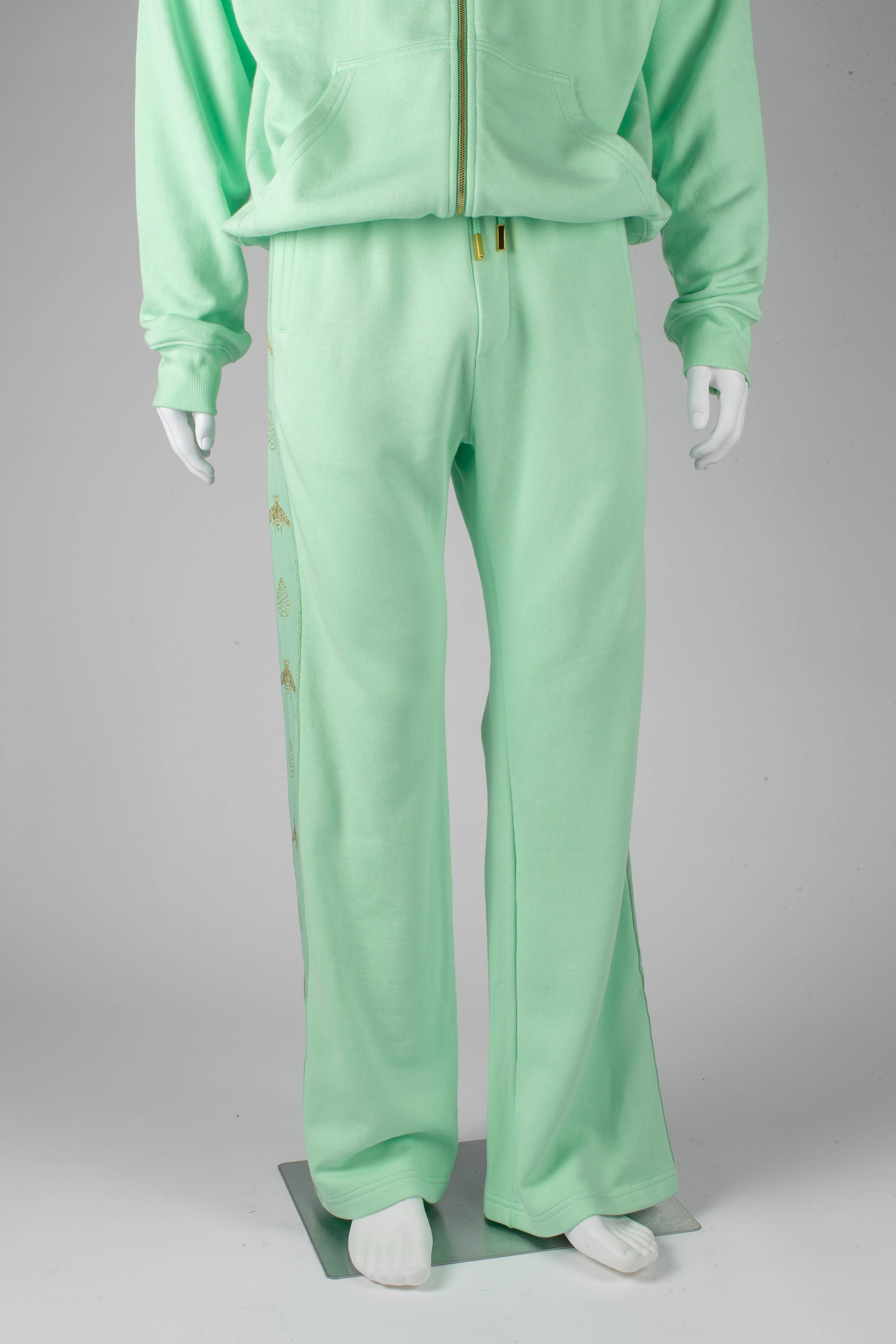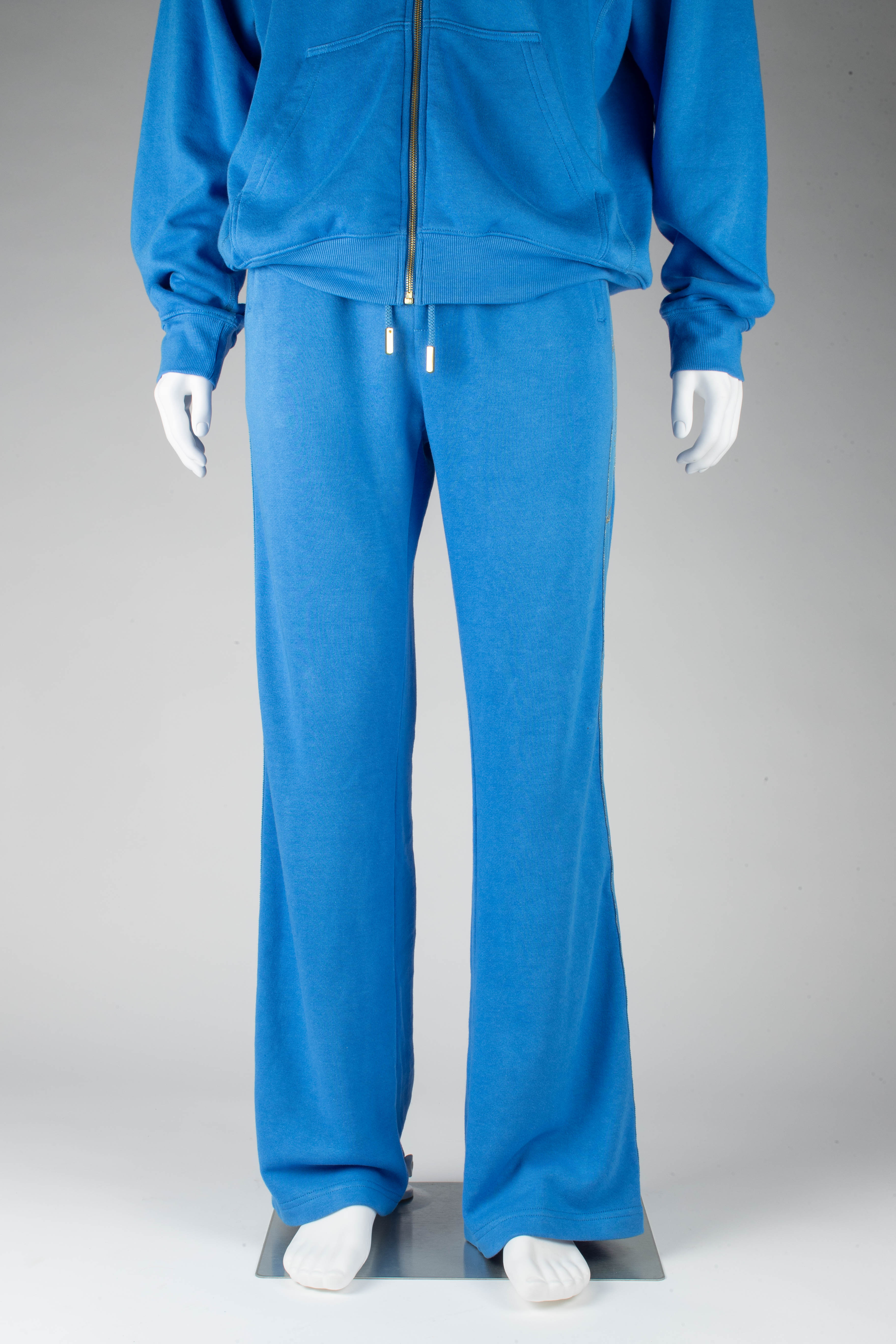 American Made Boot Cut sweat pants made with American Bamboo Cotton blend with luxe jaquard side striping in metallic gold, 4 pocket design, RiRi zippers on all pockets.